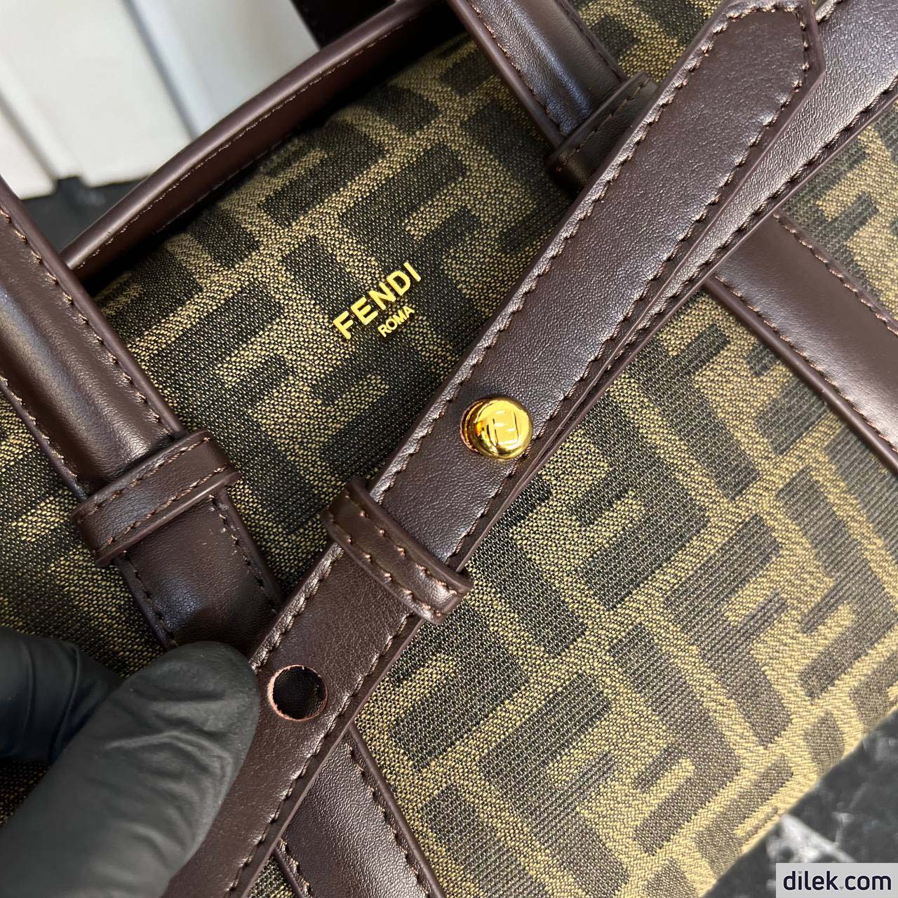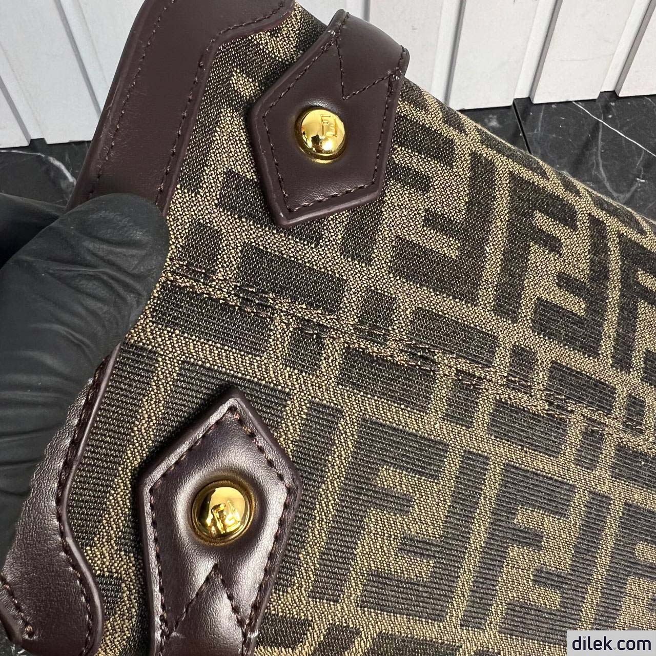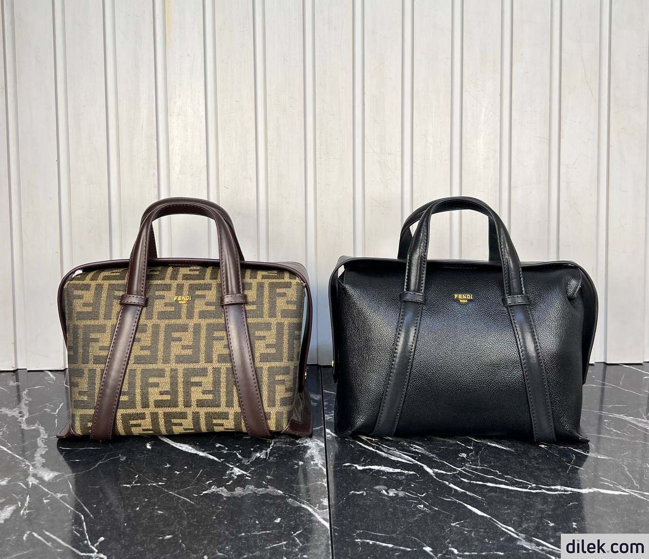 Medium Boston bag, part of the collection curated with designer Stefano Pilati, made of fabric with an FF jacquard motif trimmed with dark brown smooth leather. Retractable magnetic closure, with magnet at the sides. One lined internal compartment with two flat pockets, metal purse feet and Fendi Roma logo, gold-finish metalware. Can be carried by hand or worn cross-body thanks to the adjustable double handles and adjustable, detachable shoulder strap.