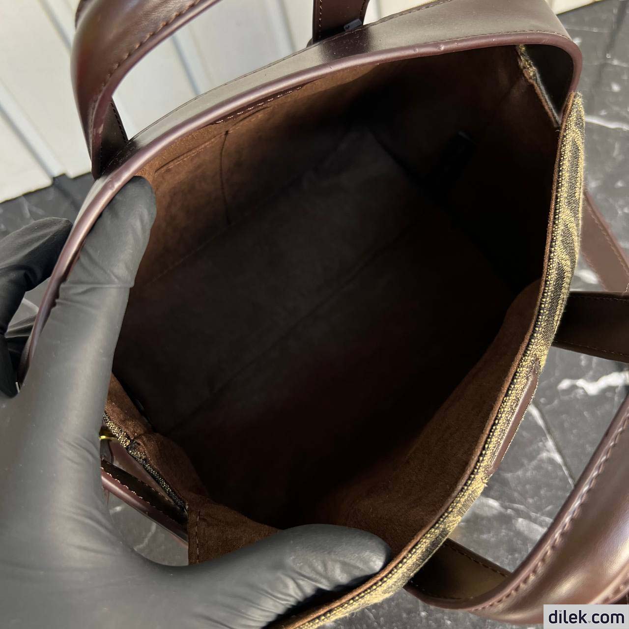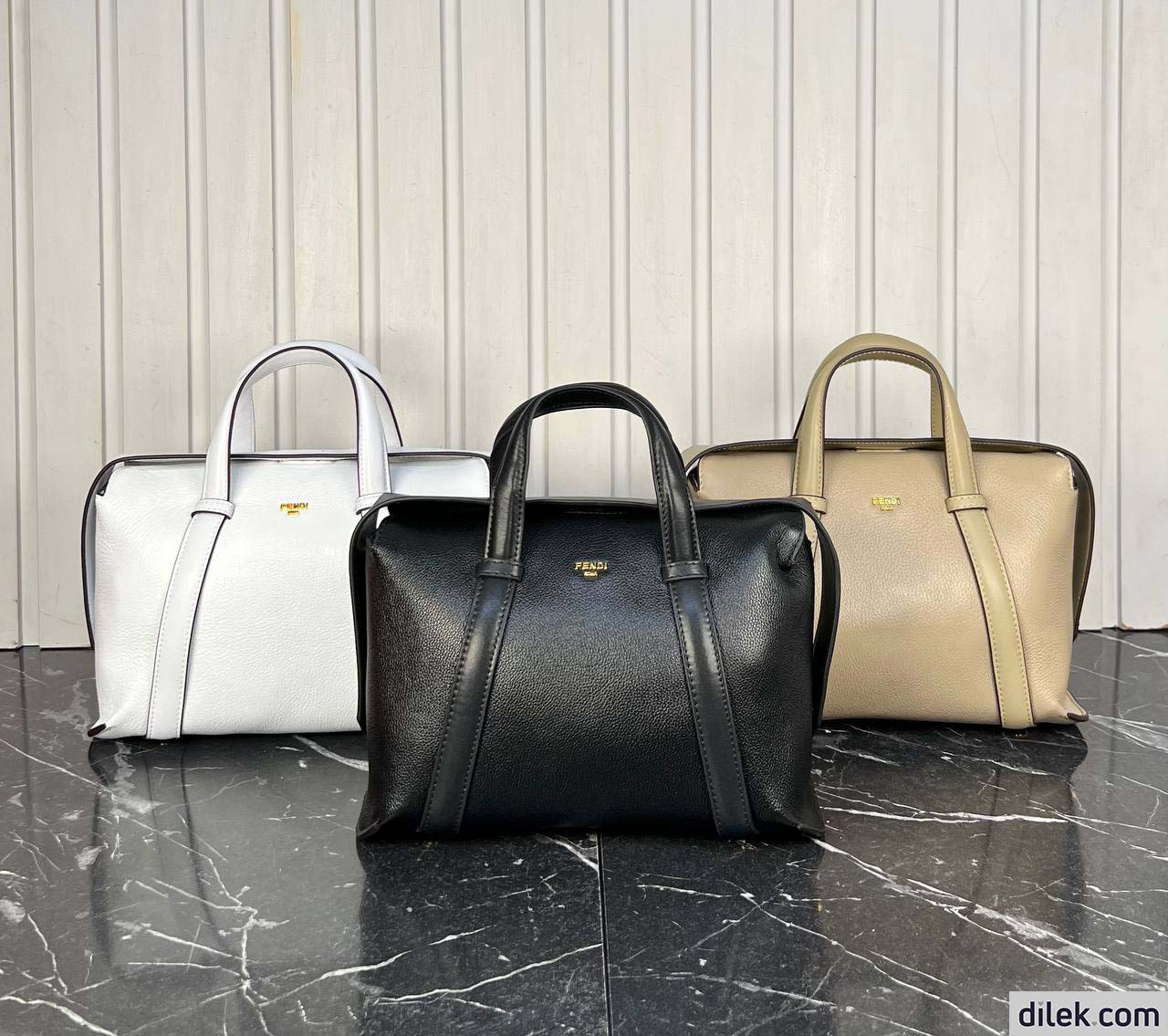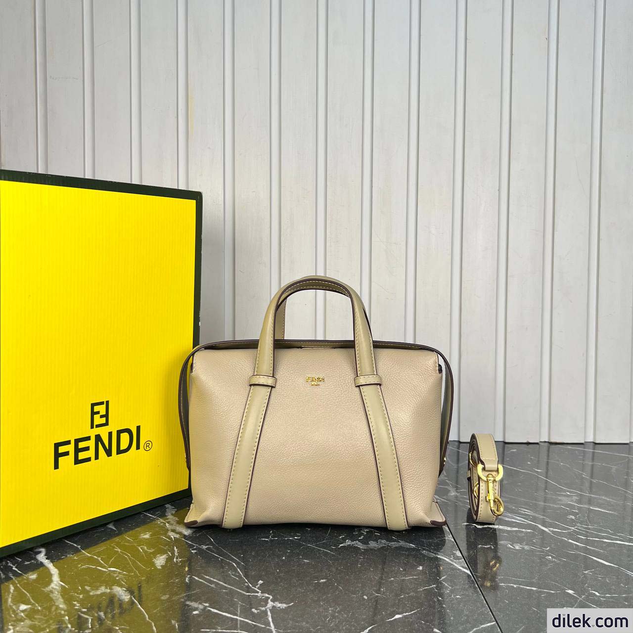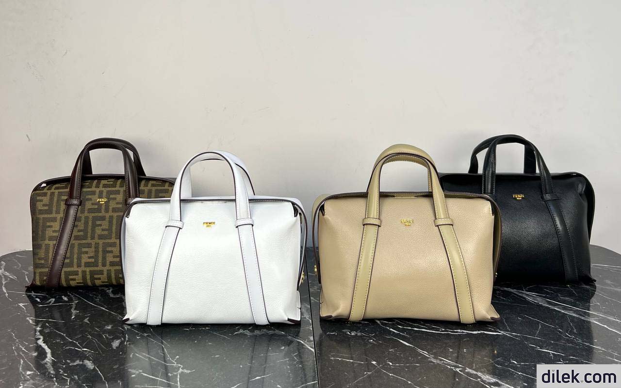 Medium Boston bag, part of the collection curated with designer Stefano Pilati, made of fabric with an FF jacquard motif trimmed with dark brown smooth leather. Retractable magnetic closure, with magnet at the sides. One lined internal compartment with two flat pockets, metal purse feet and Fendi Roma logo, gold-finish metalware. Can be carried by hand or worn cross-body thanks to the adjustable double handles and adjustable, detachable shoulder strap.
