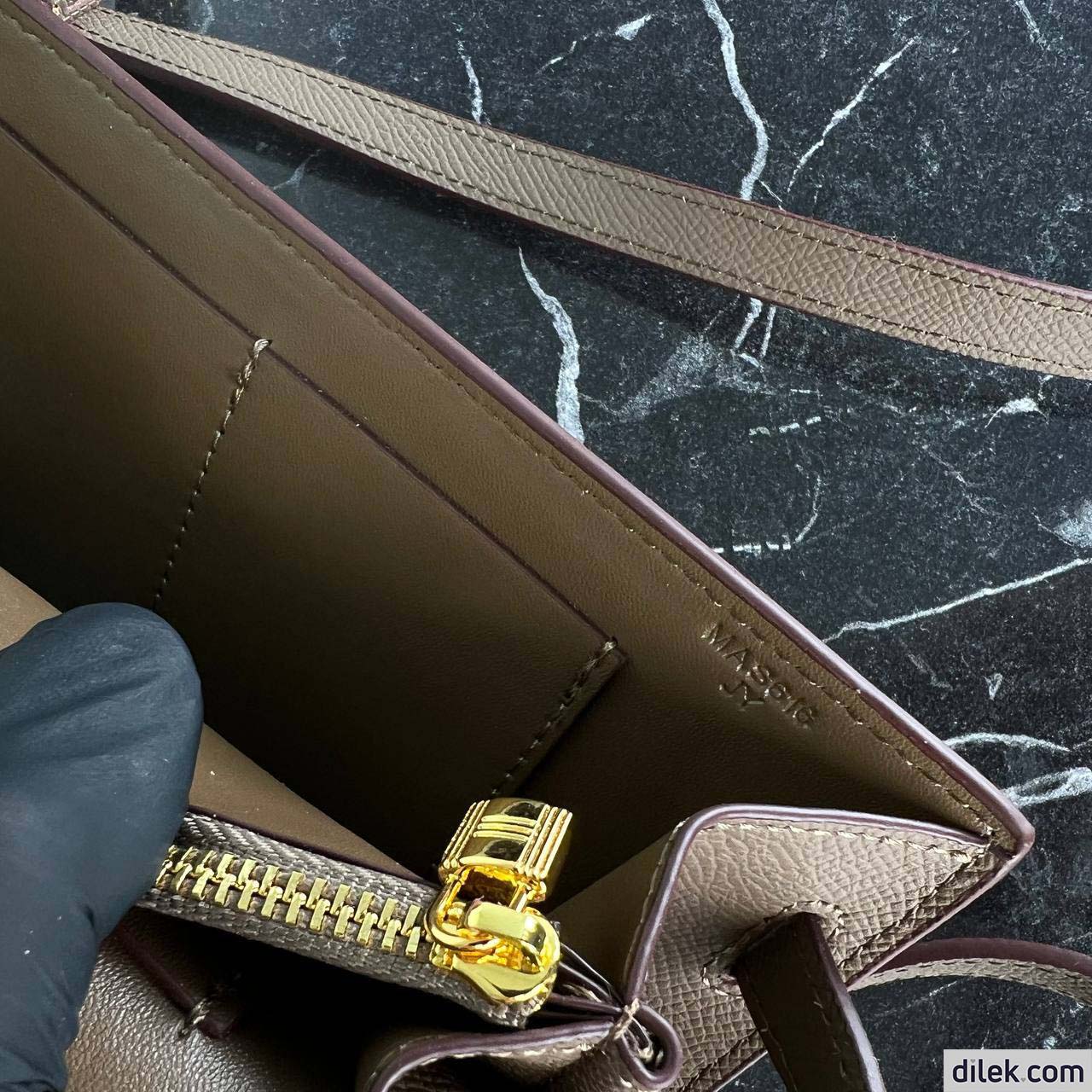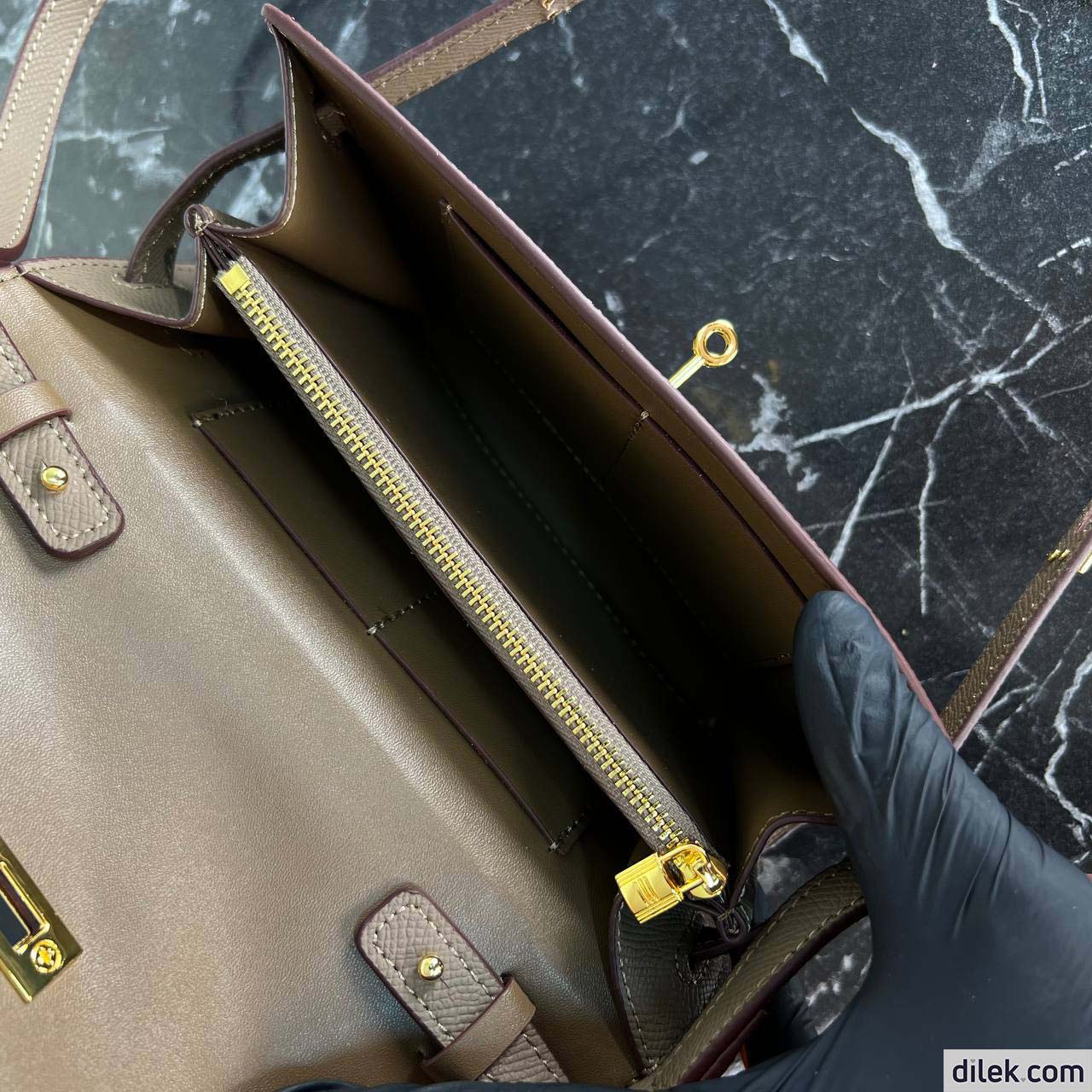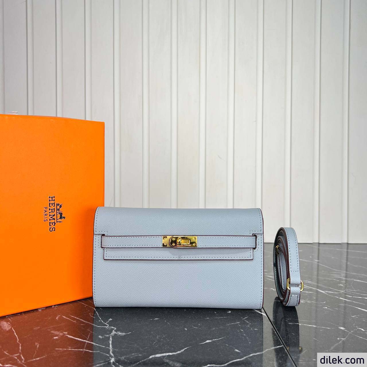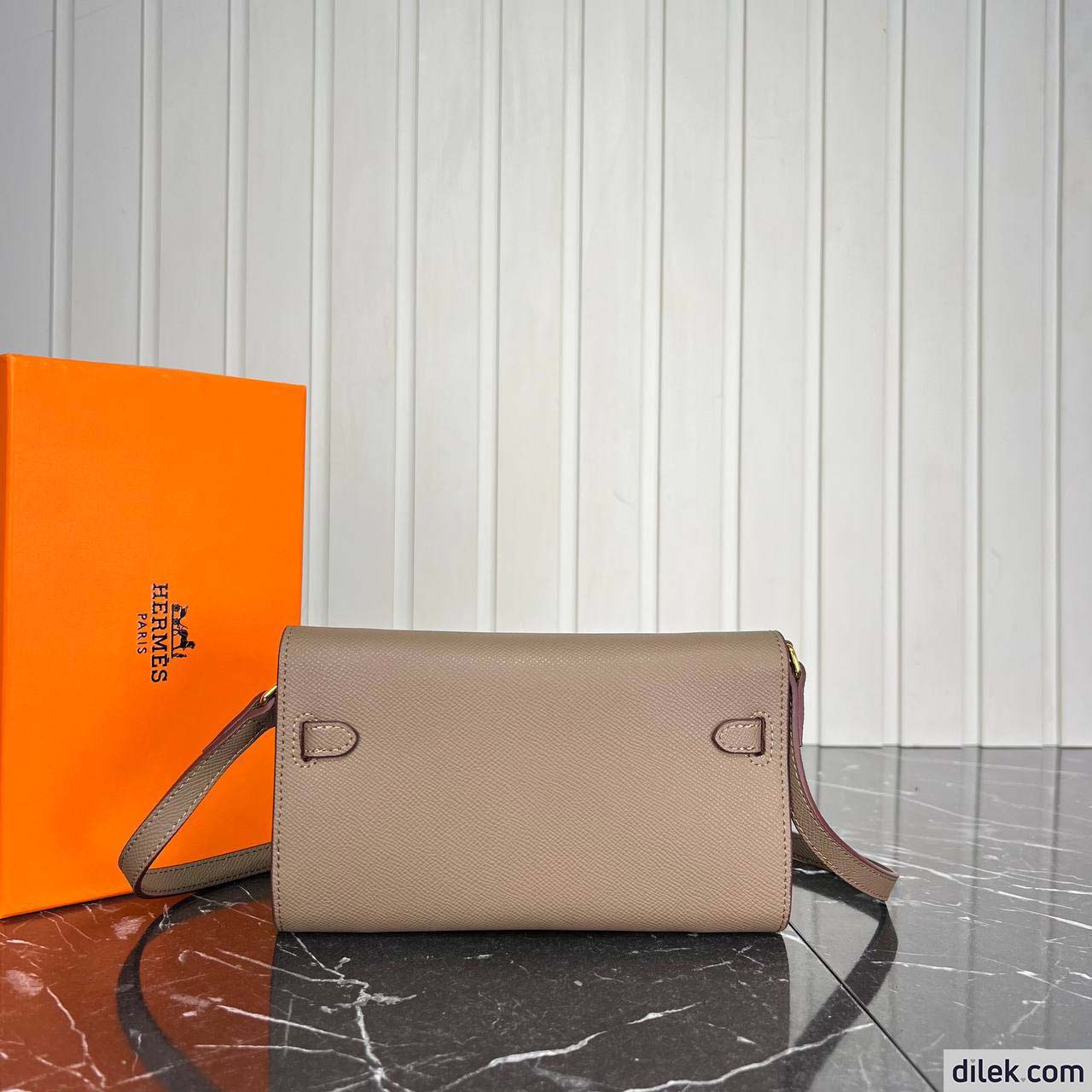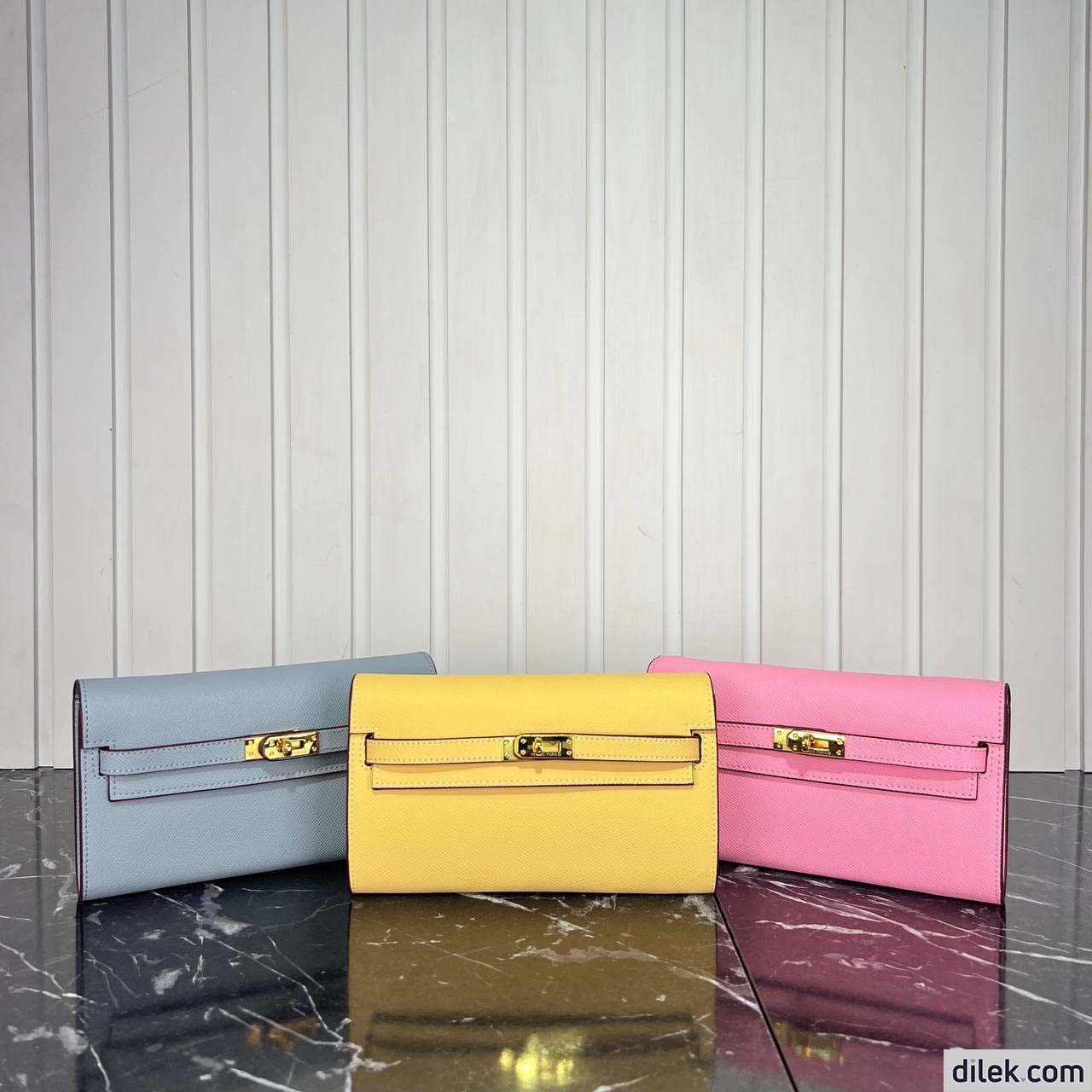 Wallet in Mysore goatskin with removable shoulder strap, 4 credit card slots, zipped change purse and gold plated Kelly closure. The addition of a removable shoulder strap transforms this iconic style into a multi-functional piece - switch from a classic wallet to a crossbody bag in one fell swoop!