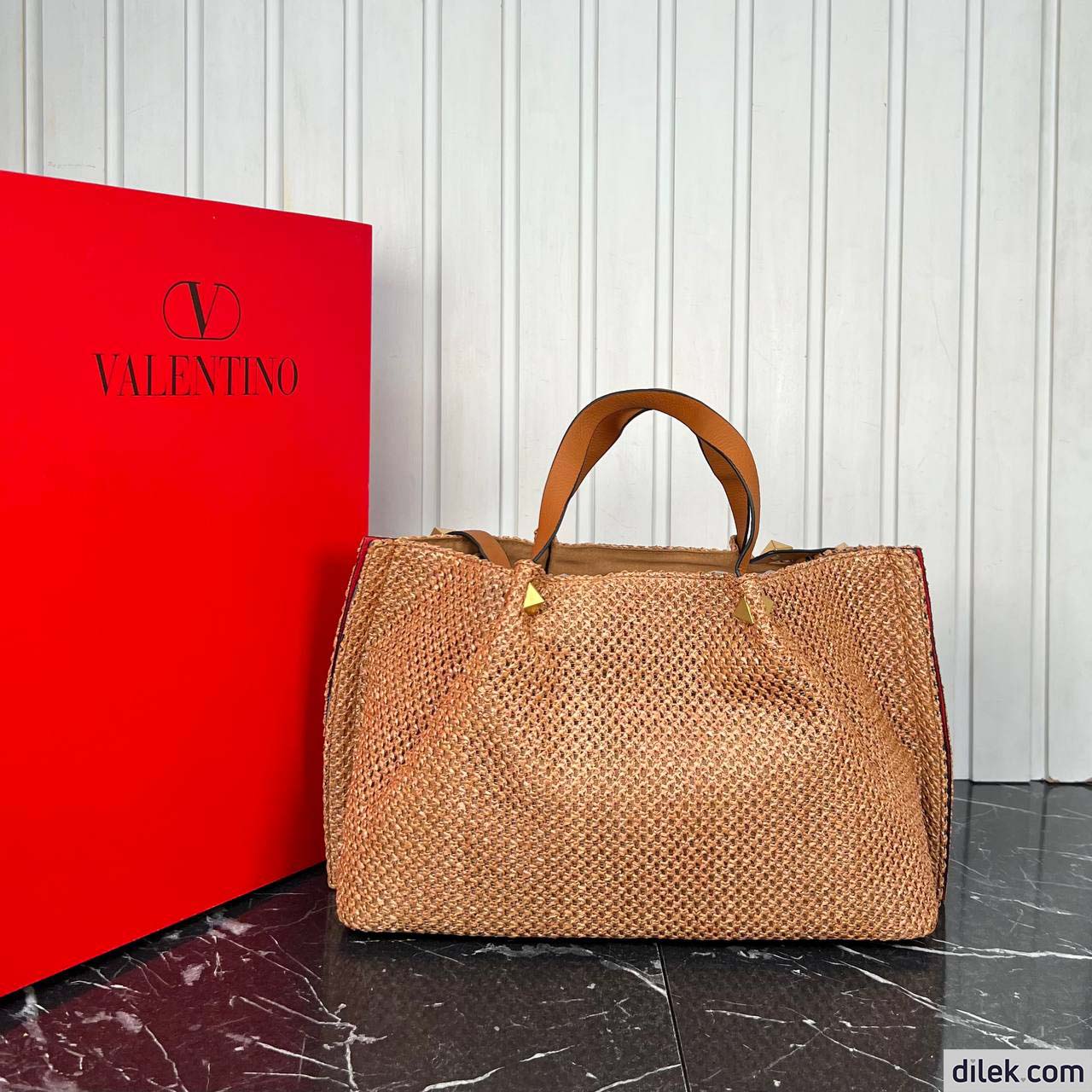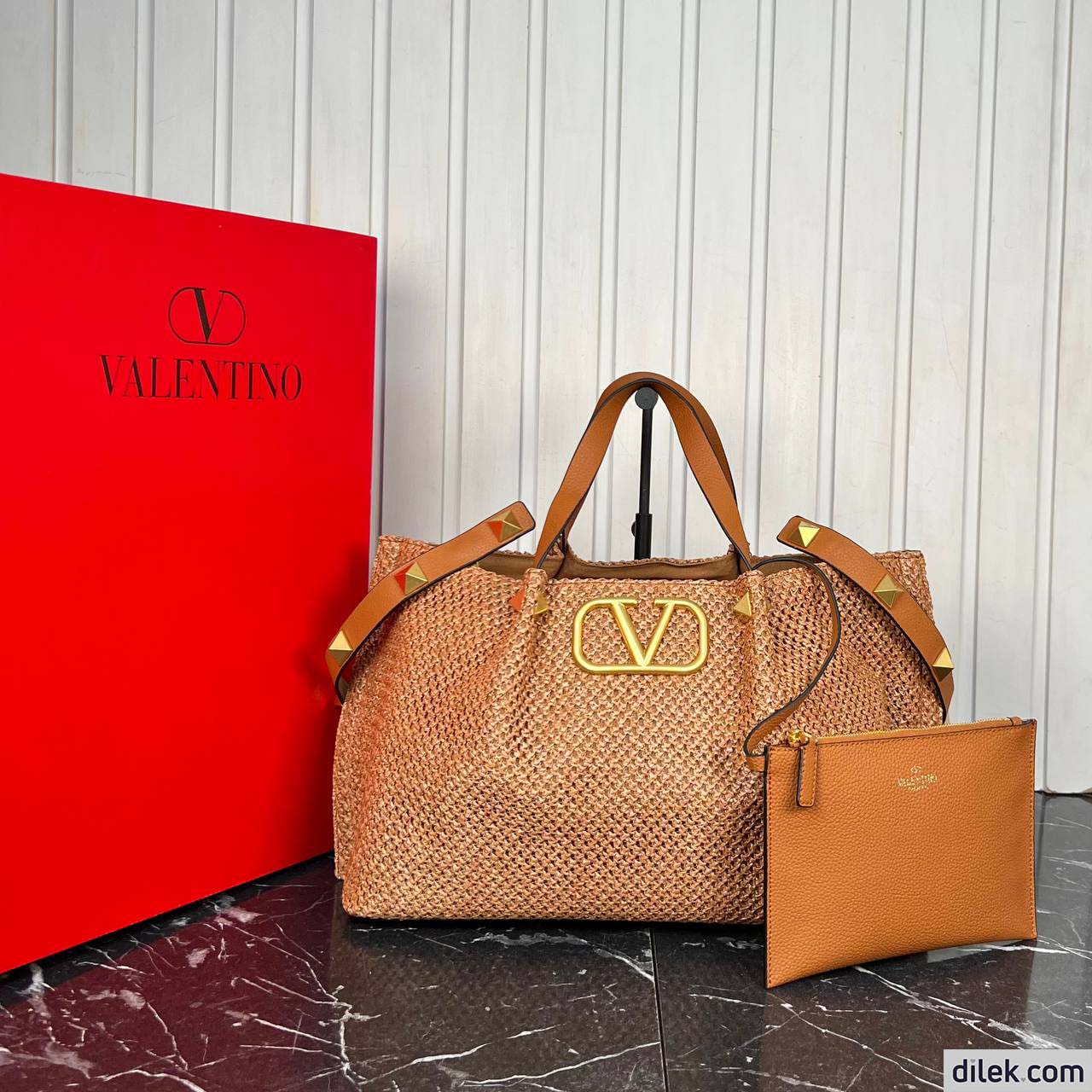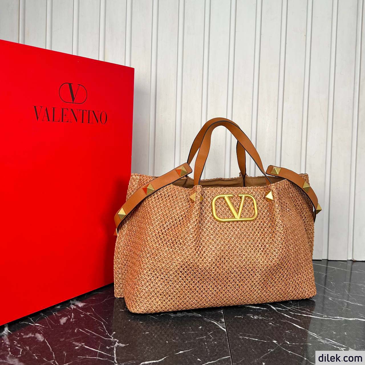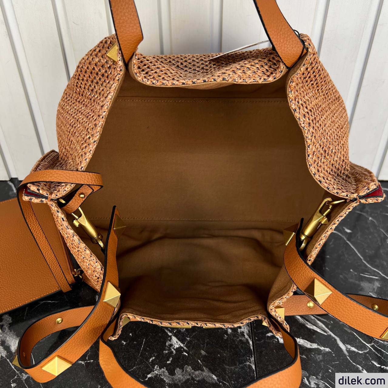 Valentino Garavani medium shopping bag in synthetic raffia featuring metal VLogo Signature and leather detail on the sides. The shoulder strap features the iconic maxi studs.