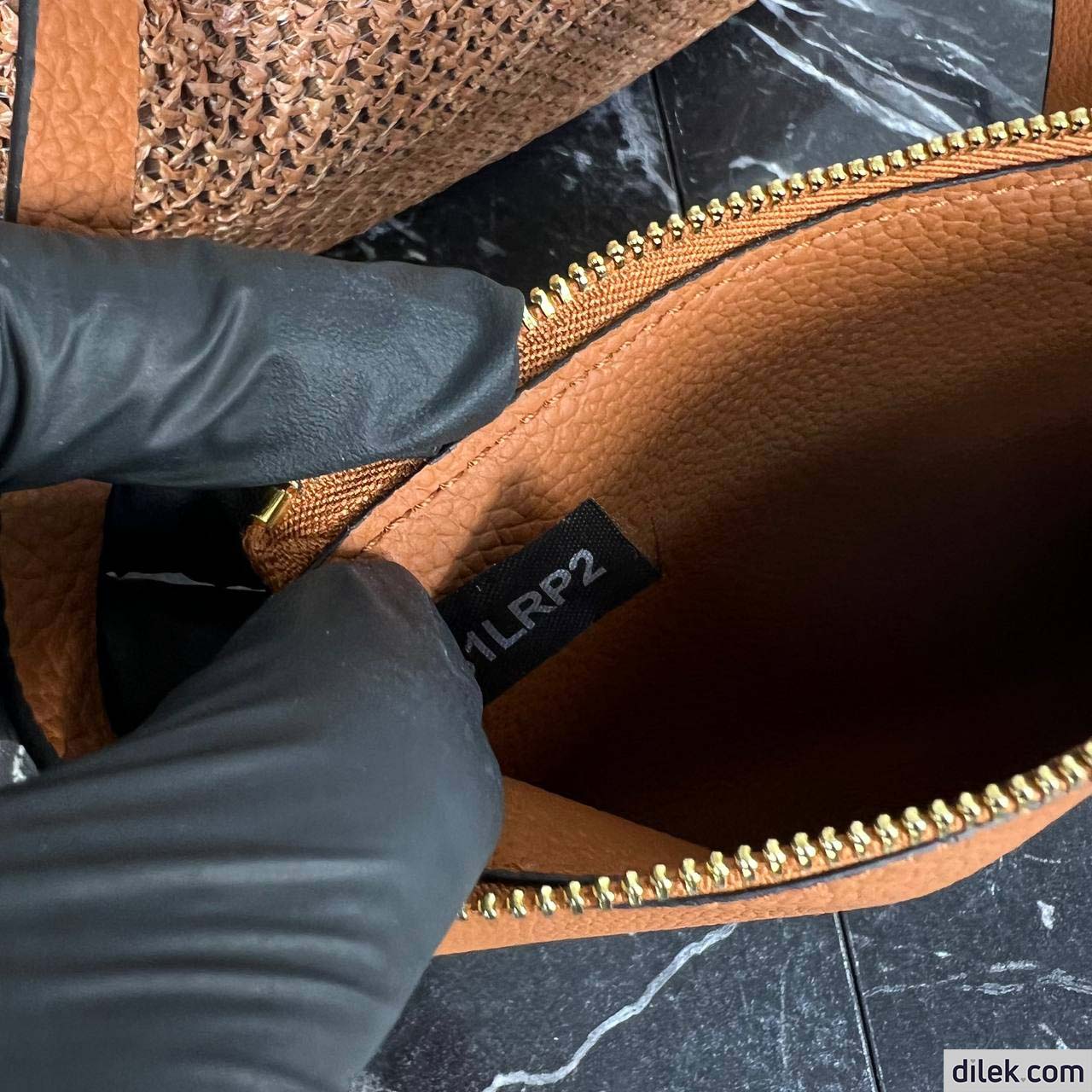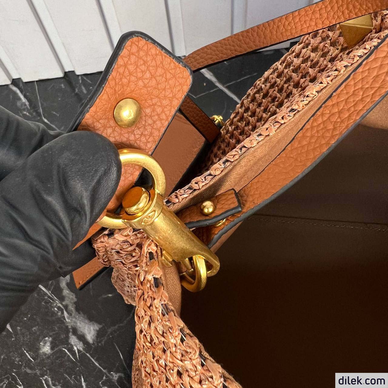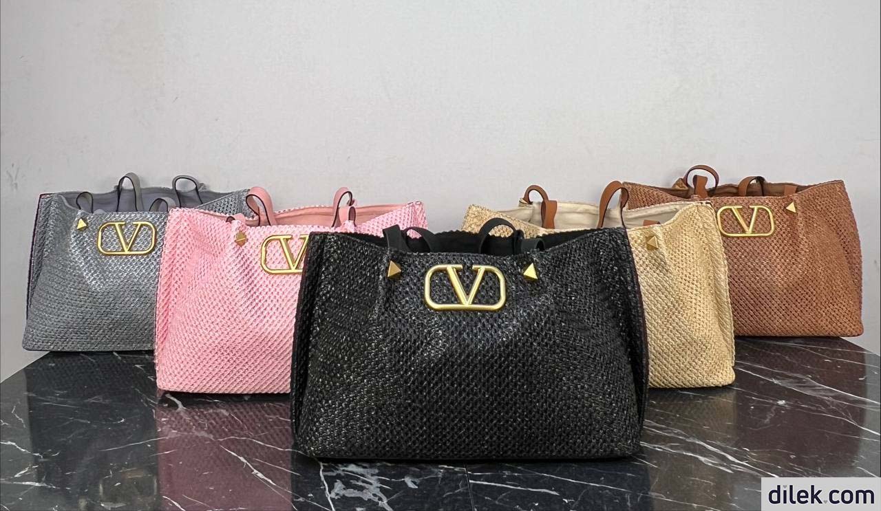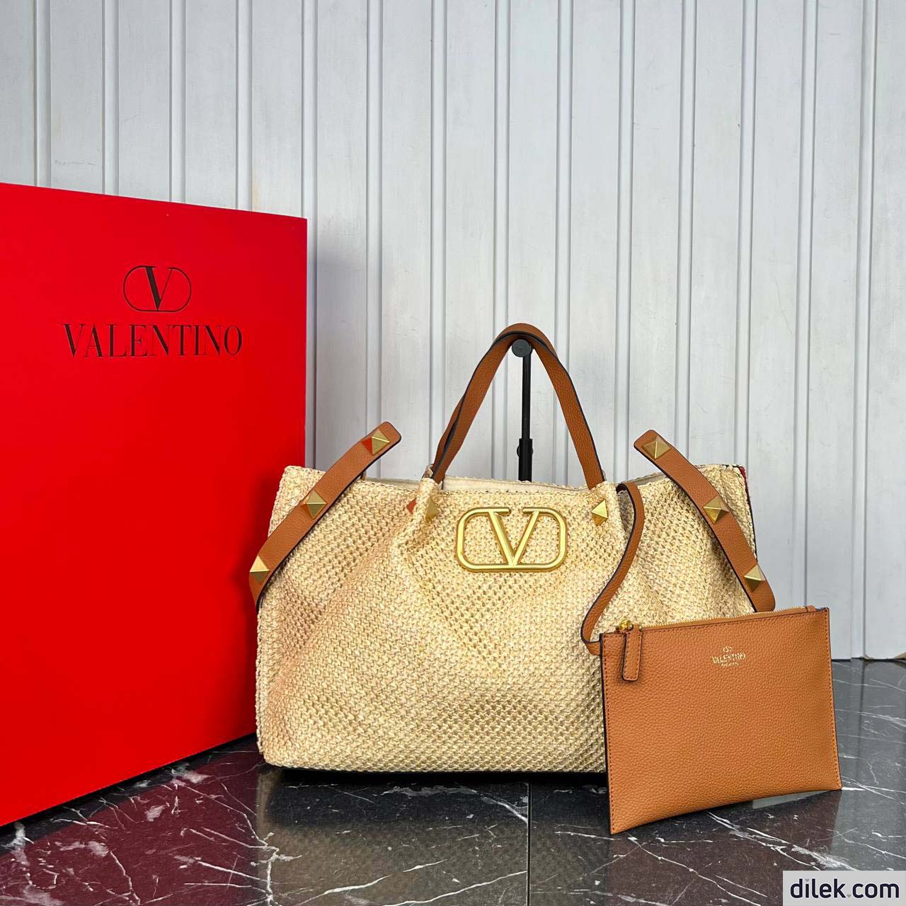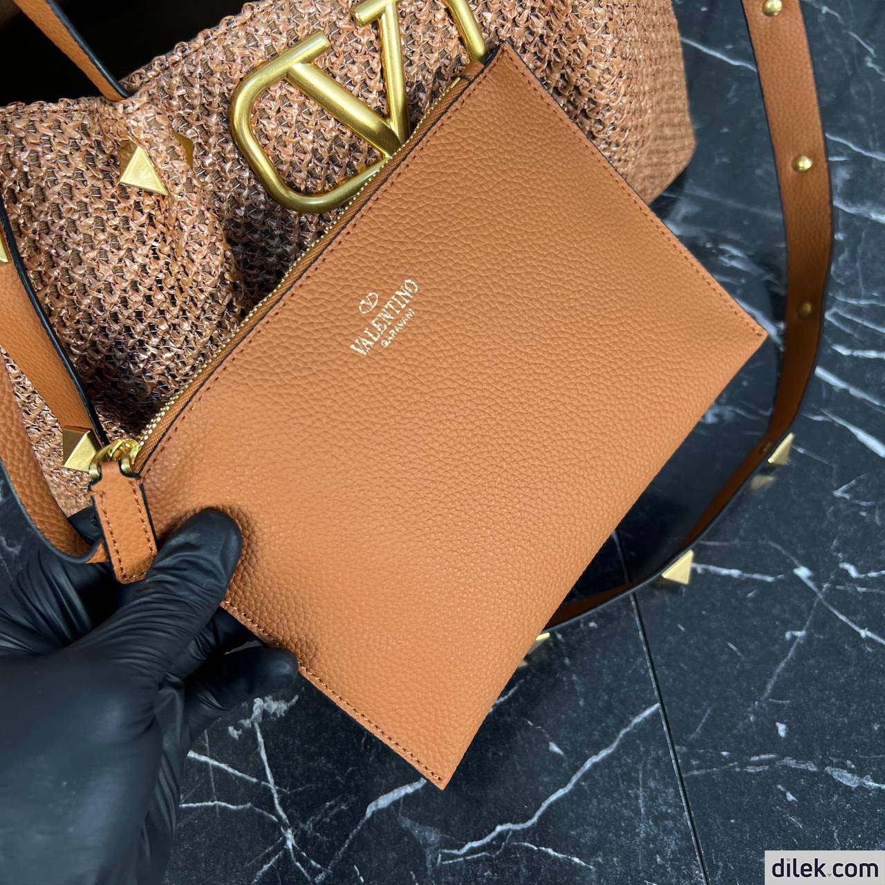 Valentino Garavani medium shopping bag in synthetic raffia featuring metal VLogo Signature and leather detail on the sides. The shoulder strap features the iconic maxi studs.
