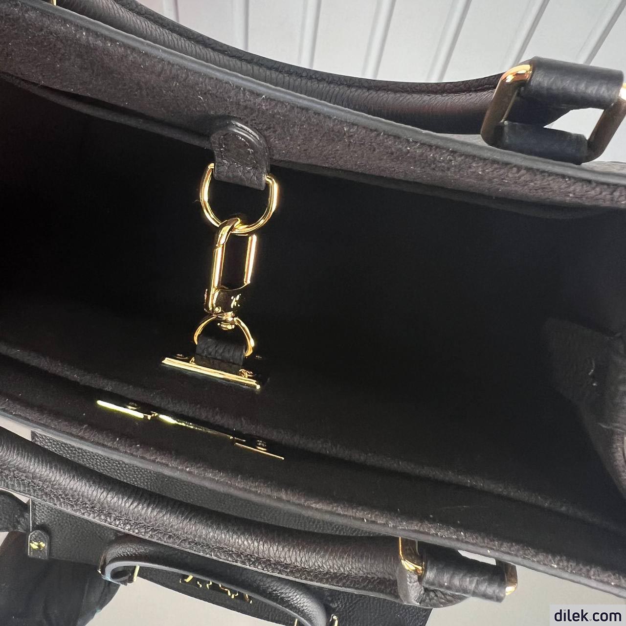 With its sleek design and sophisticated details, the Lock & Go handbag embodies effortless chic. Fashioned from smooth grained calf leather, it is finished with a gleaming LV turn lock, engraved rivets and a hot-stamped Louis Vuitton signature. Perfect for daily use, this versatile bag has both top handles and an adjustable, detachable strap for shoulder or cross-body wear.