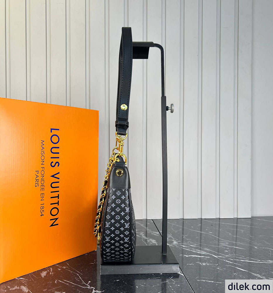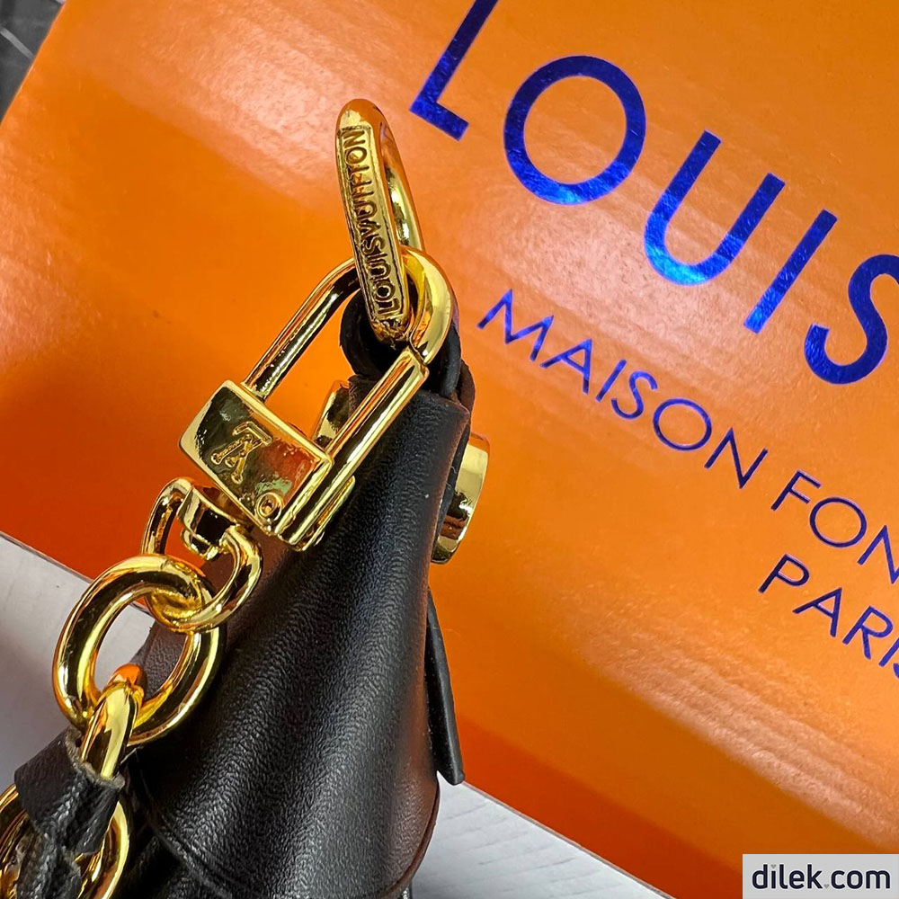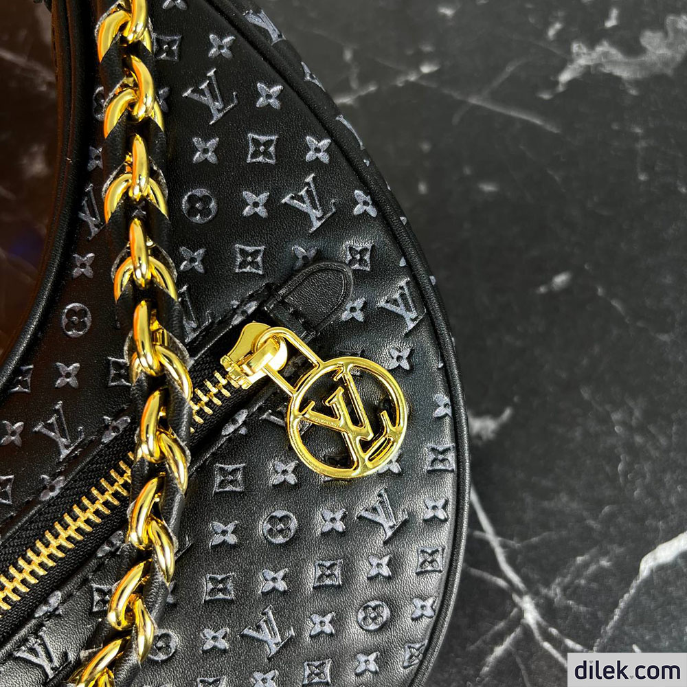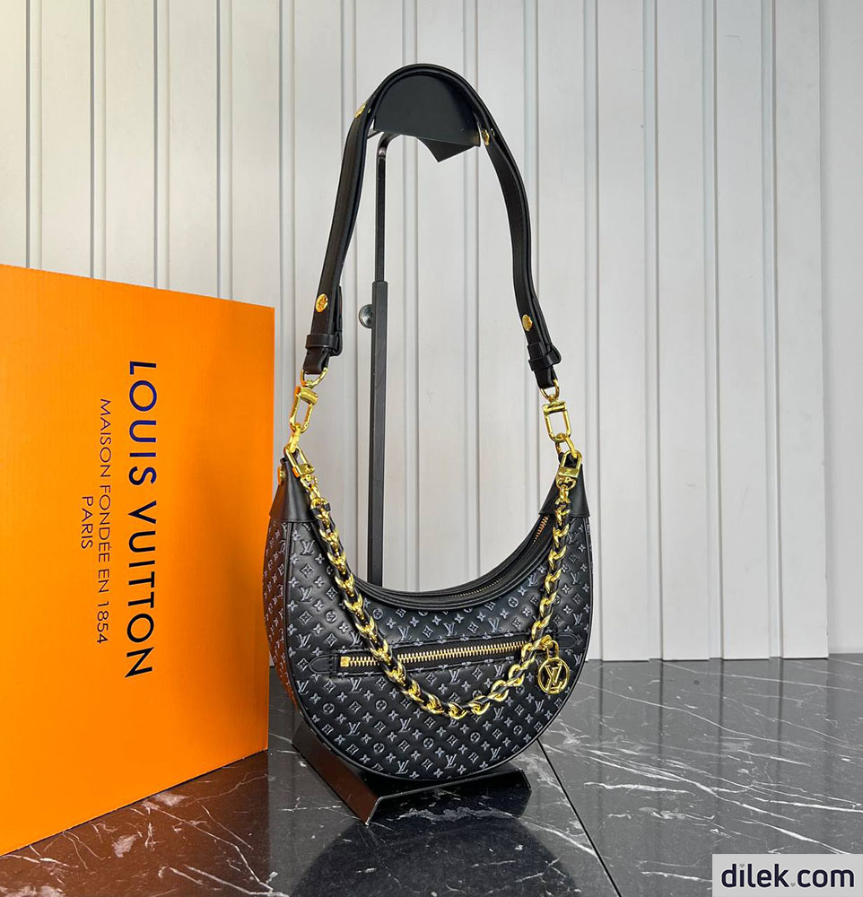 The Loop baguette handbag is fashioned from calfskin with a nano version of the Monogram embossed into the leather. The colored silk-screened LVs and Monogram Flowers contrast subtly with the base. The bag is accented with gold finish on the chain and the emblematic LV Circle zip pull.