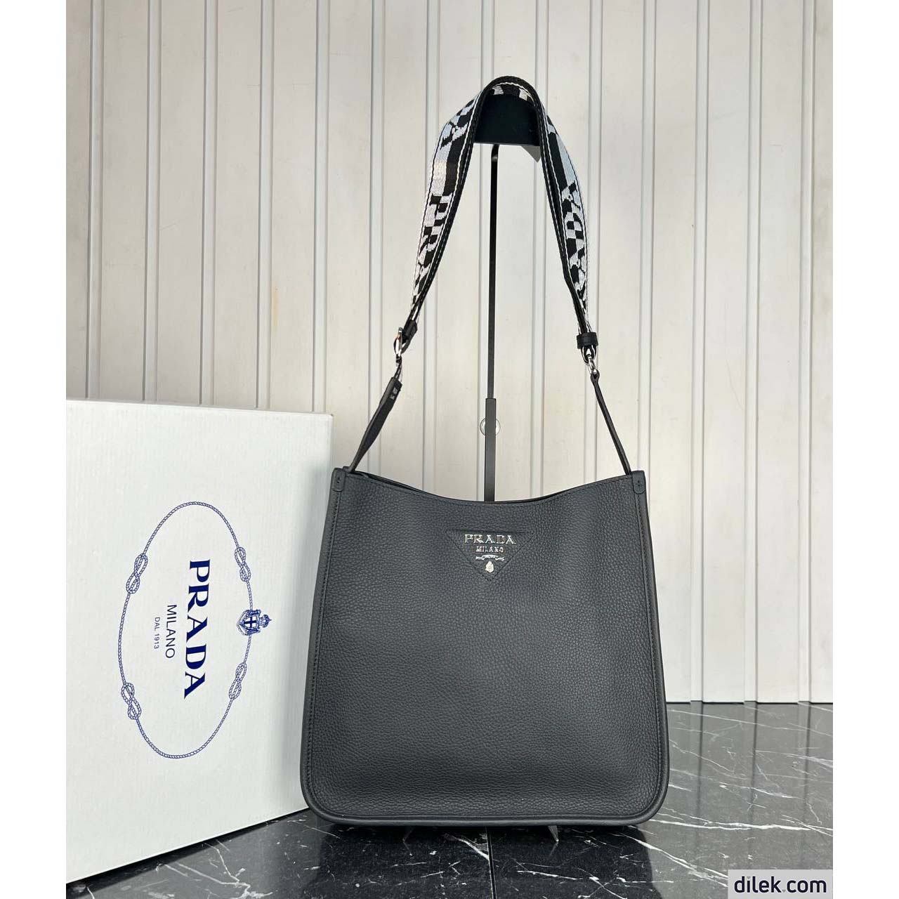 This soft leather hobo bag expresses modern elegance and is decorated on the front by the metal lettering logo. The adjustable embroidered logo-print woven tape shoulder strap adds a sporty note.