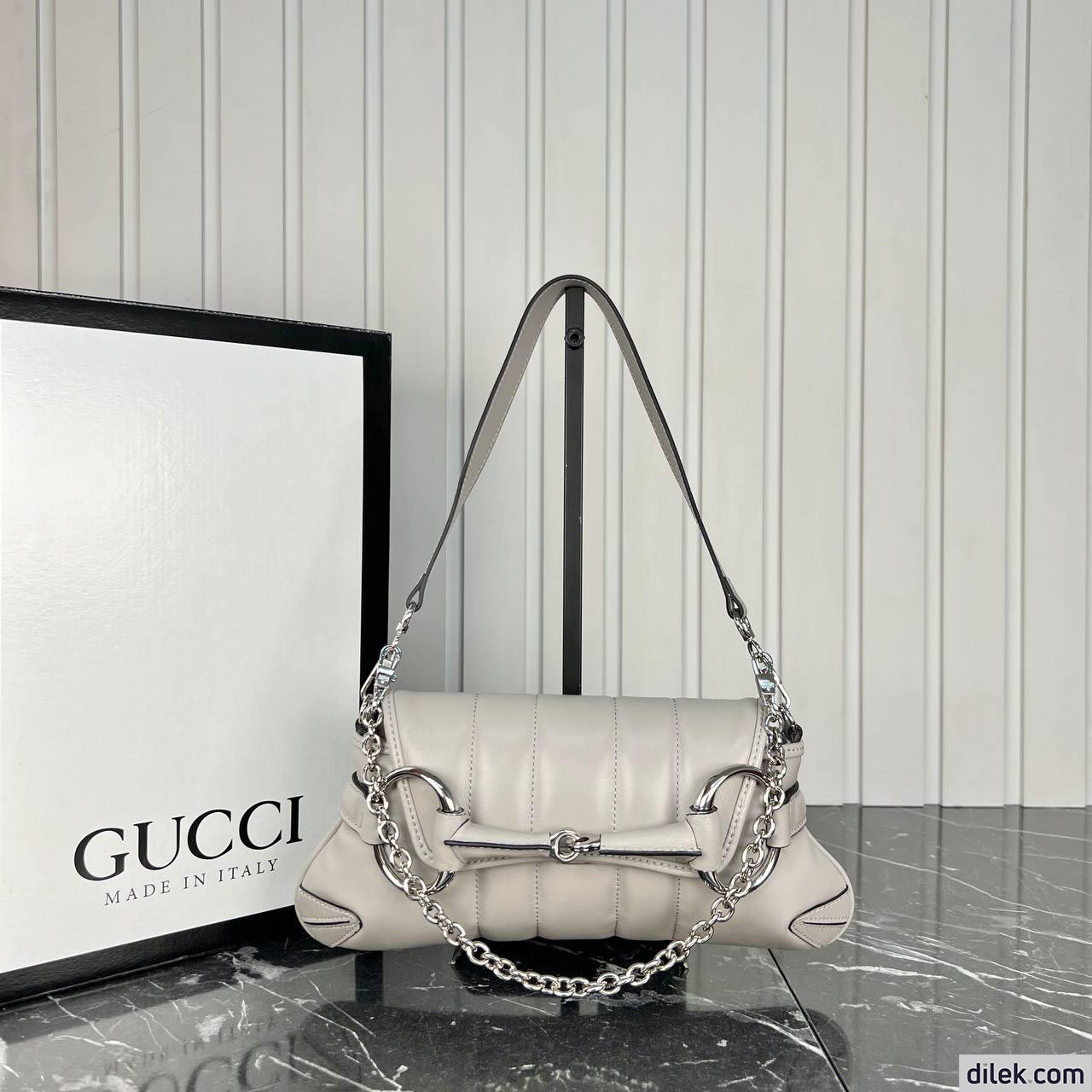 Gucci successfully recalls its past by connecting the archives to the present day. Adorned with a maxi Horsebit, first made popular during the early ‘2000s, this silhouette continues to be one of the most recognizable handbags of the House. Revisited for the Fall Winter 2023 collection, it is presented in various colors and textures that follow a contemporary approach.