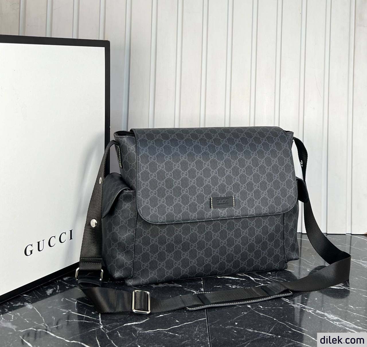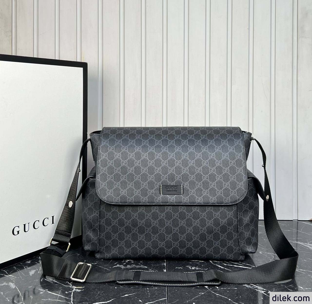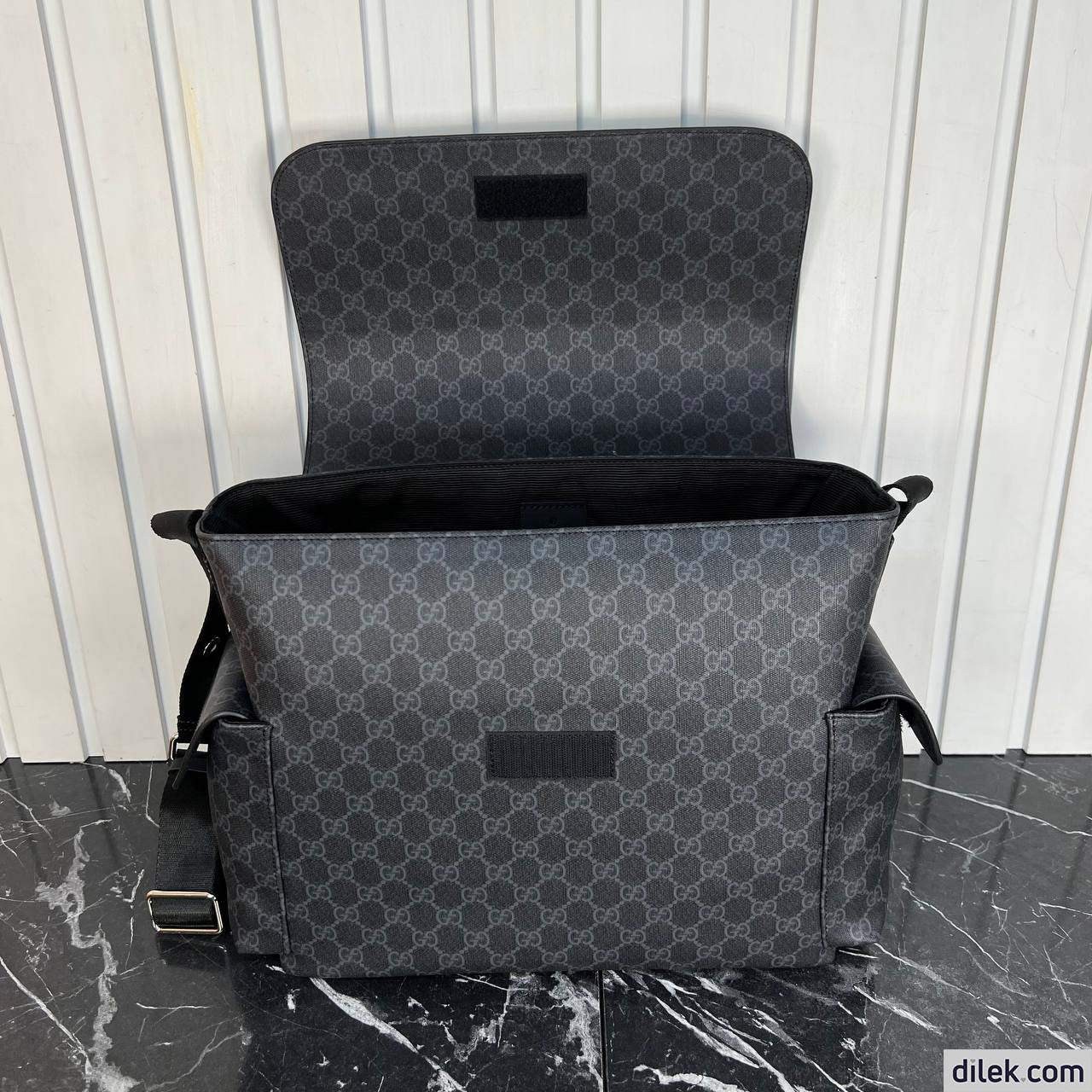 GG Supreme canvas diaper bag, designed with multiple pockets and fold-out changing mat.